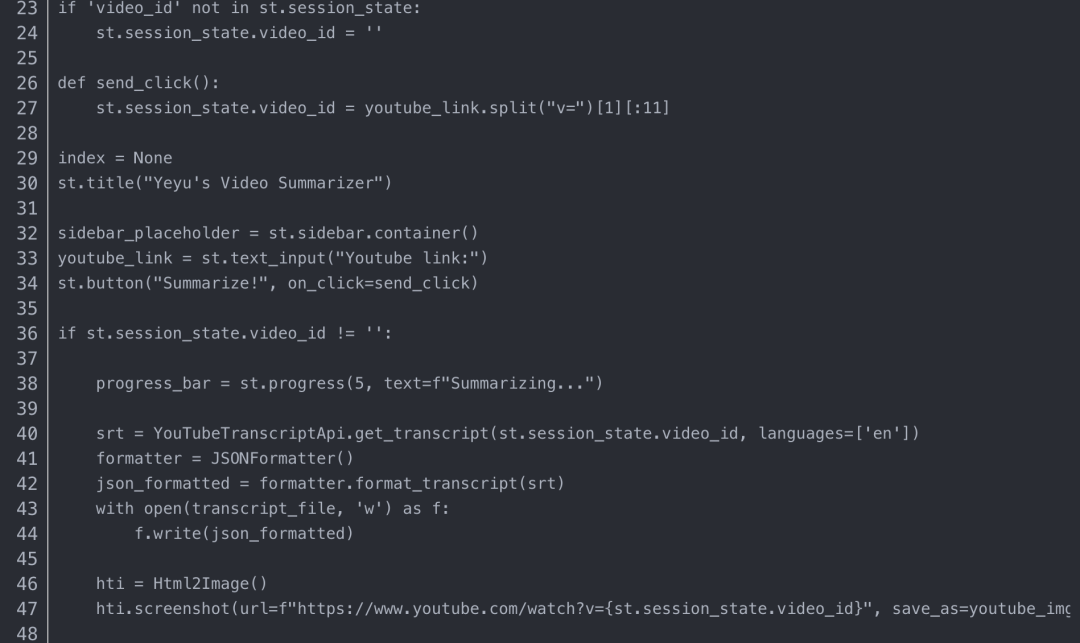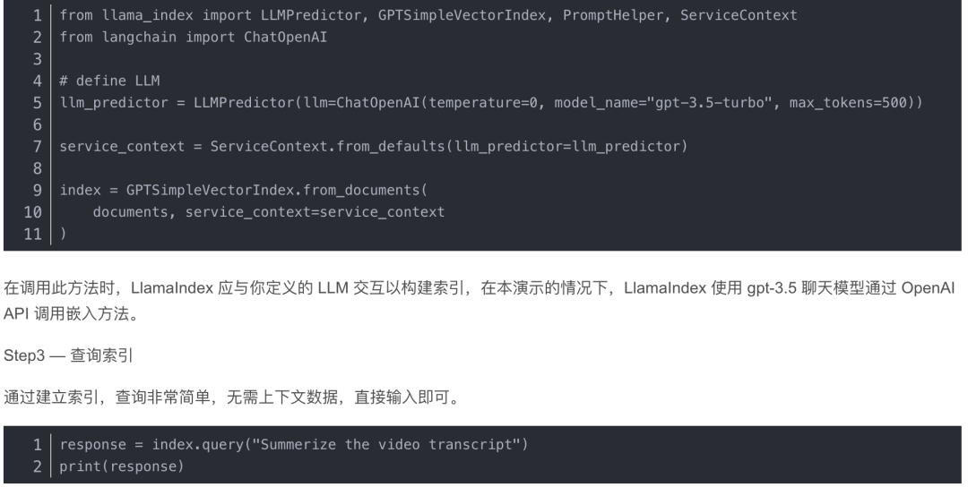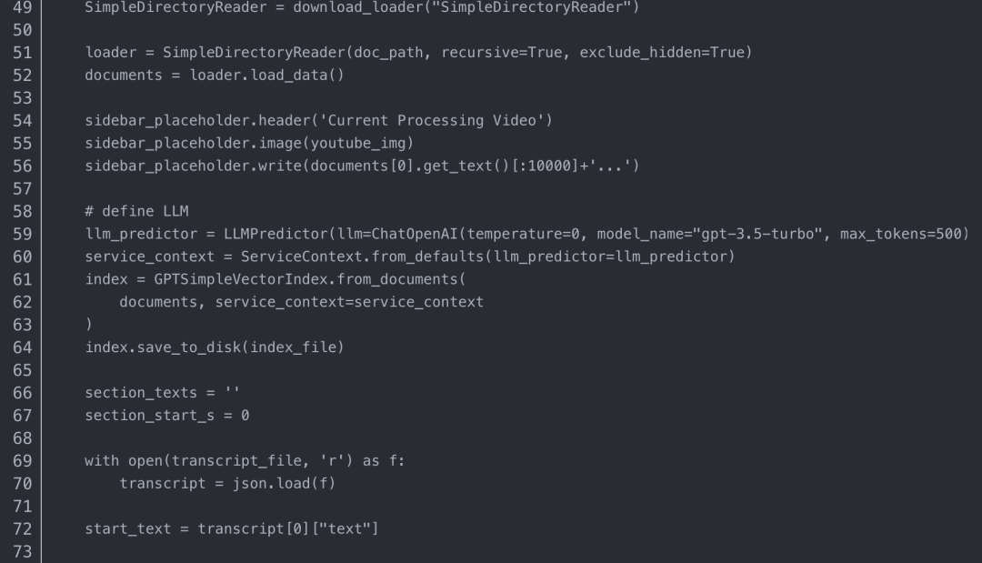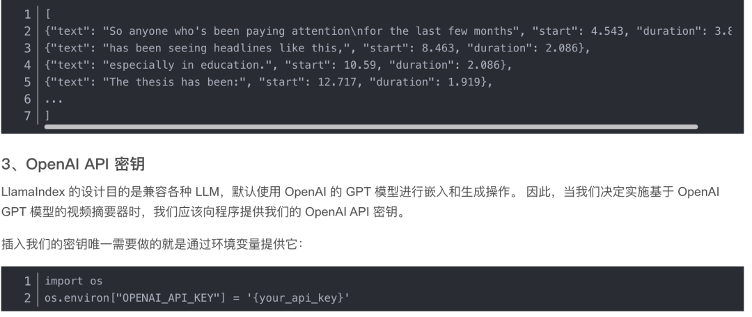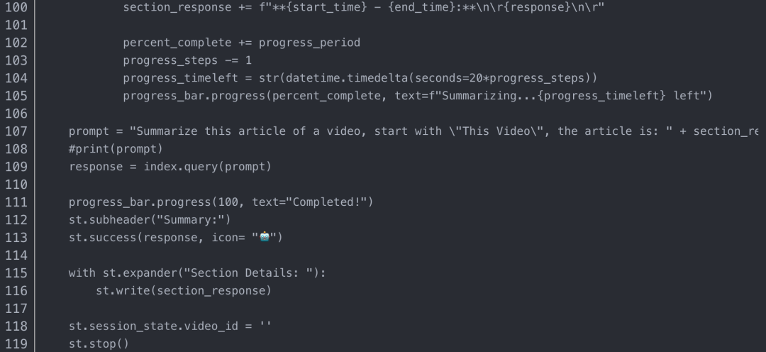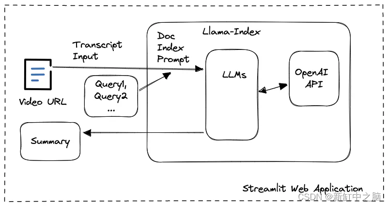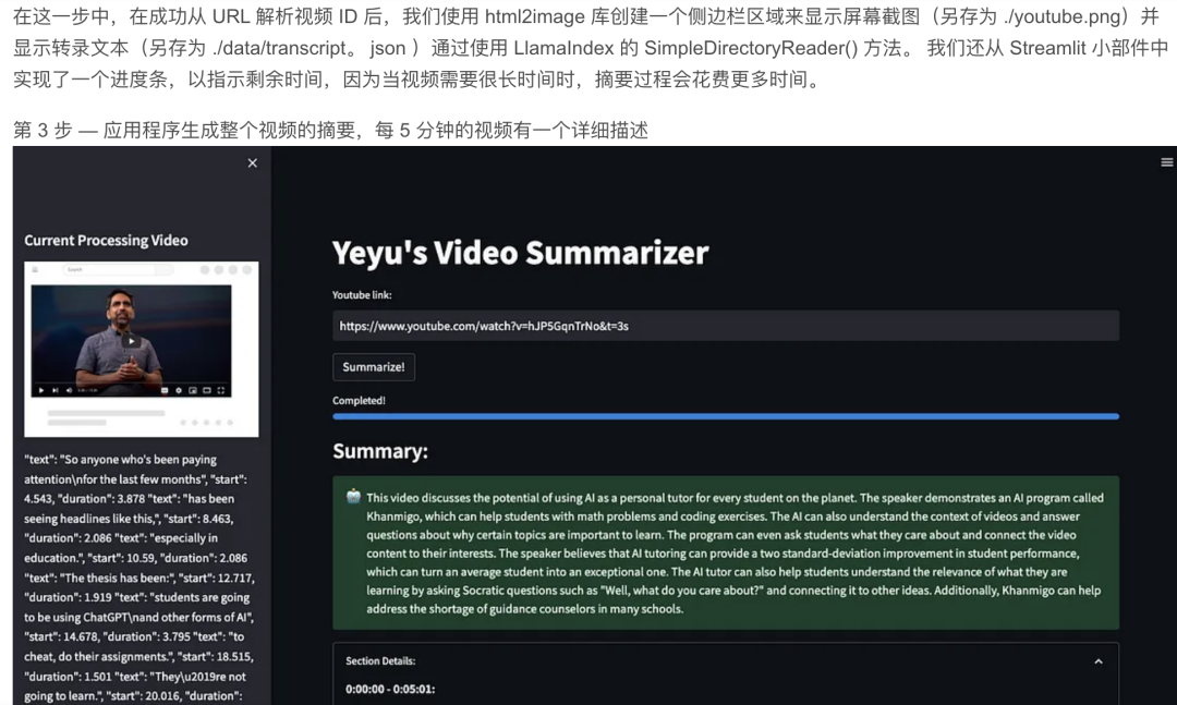 在这个Video Summarizer应用程序中,我们以llama-index为基础,开发了一个Streamlit web应用程序,为用户提供视频URL的输入以及屏幕截图、文字记录和摘要内容的显示。使用 llamaIndex 工具包,我们不必担心 OpenAI 中的 API 调用,因为对嵌入使用的复杂性或提示大小限制的担忧很容易被其内部数据结构和 LLM 任务管理所覆盖。