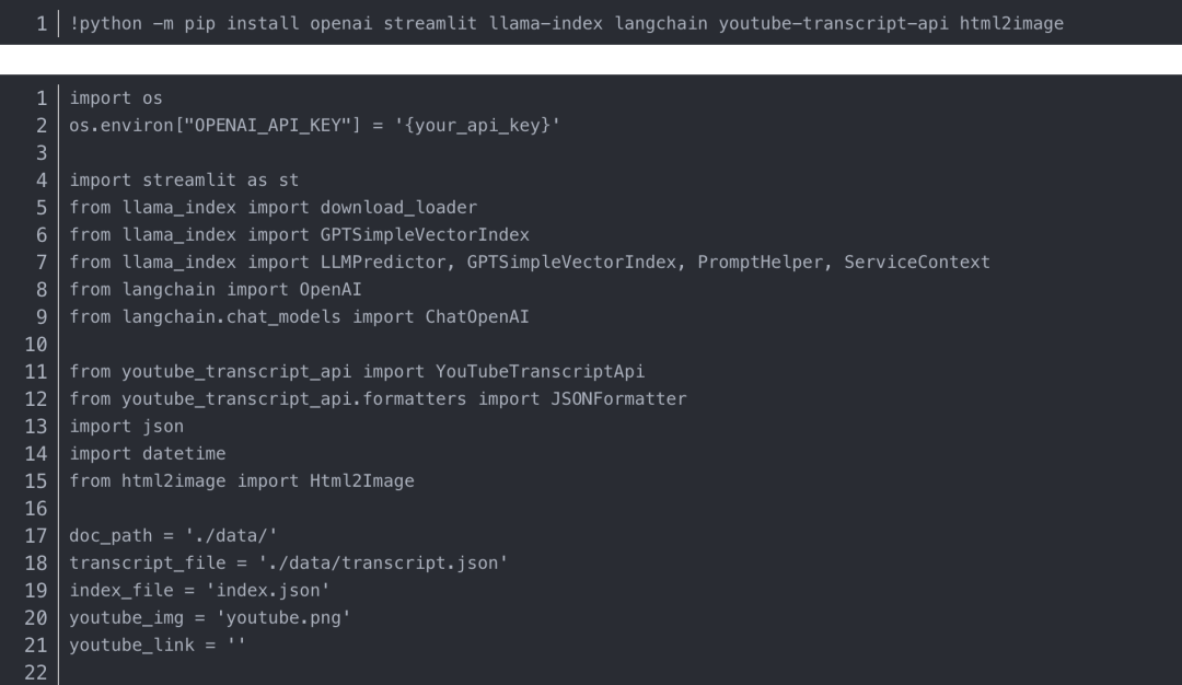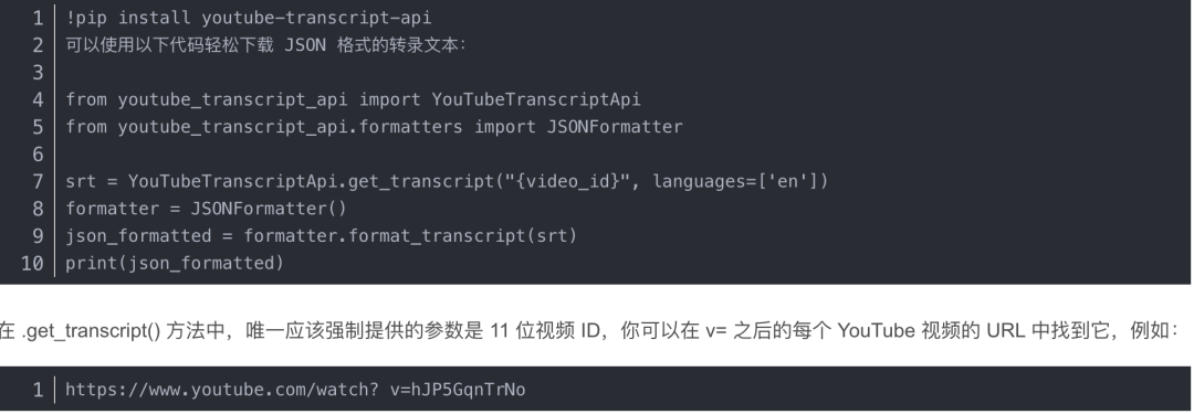 总结 YouTube 视频的第一步是下载转录文本。有一个名为 youtube-transcript-api 的开源 Python 库可以完美满足我们的要求。