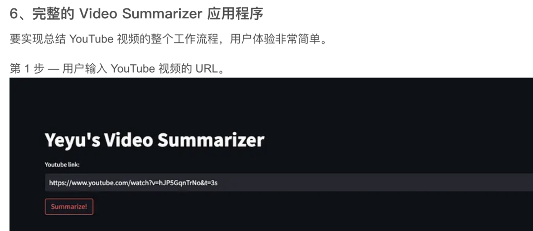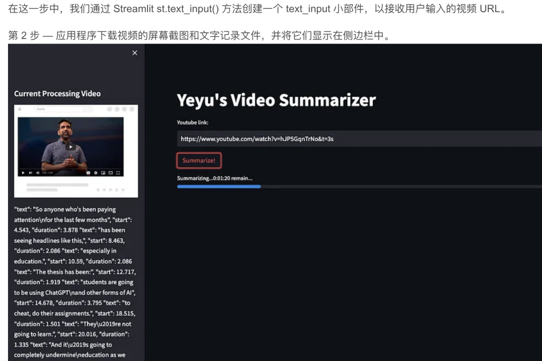 通过将数小时的视频内容转换为几行准确的摘要文本,视频摘要器可以快速为我们提供视频的要点,这样我们就不必花费大量时间来完整观看它。在我创建这个网络应用程序之后,我最常使用的场景是参考它的摘要来决定某个视频是否值得观看,尤其是那些辅导、脱口秀或演示视频。