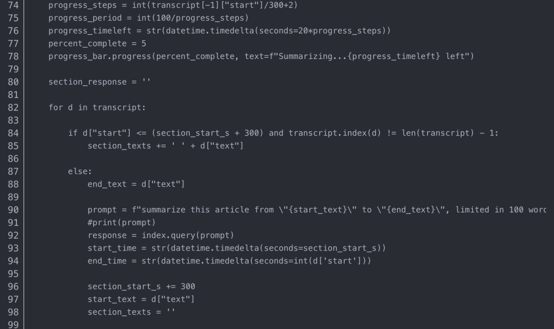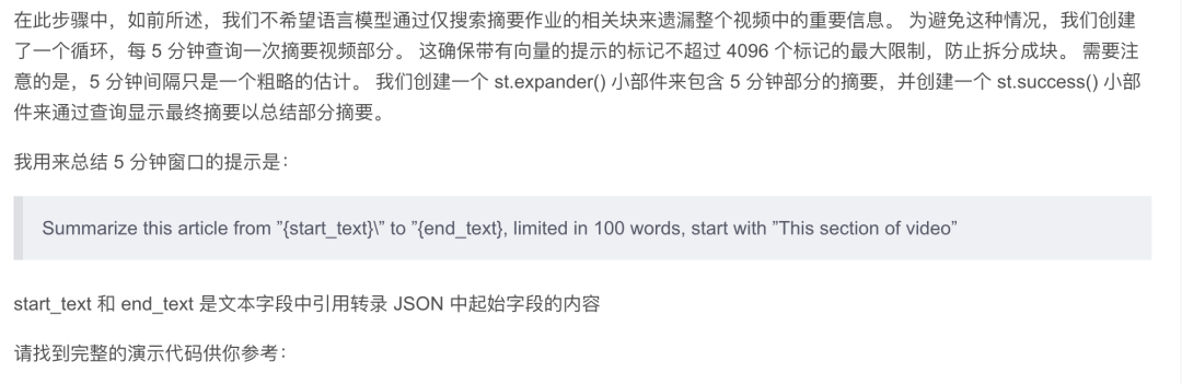 一个更有前途的选择是使用上下文学习技术对转录本进行向量化,并使用向量向语言模型提示“摘要”查询。这种方法可以生成准确的答案,指示转录文本的摘要,并且不限制视频长度。