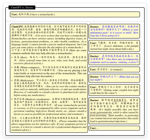 基于医生回复和 ChatGPT 回复,让语言模型成为医生提供丰富且准确的问诊。![]()