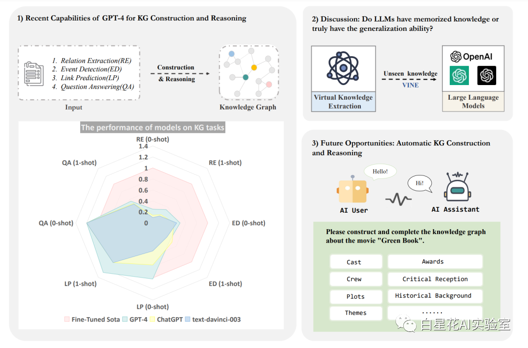 早期,知识图谱的构建和推理主要依赖于监督学习方法。然而,近年来,随着大型语言模型(LLMs)的显著进步,研究人员已经注意到它们在自然语言处理(NLP)领域的卓越能力。尽管有许多关于LLMs的研究(Liu et al., 2023;Shakarian et al., 2023;Lai et al., 2023),但在知识图谱领域系统地探索它们的应用仍然有限。为了解决这个问题,我们的工作研究了LLMs(如ChatGPT和GPT-4,OpenAI,2023)在知识图谱构建、知识图谱推理任务中的潜在应用性。通过理解LLMs的基本能力,我们的研究进一步深入了解了该领域的潜在未来方向。