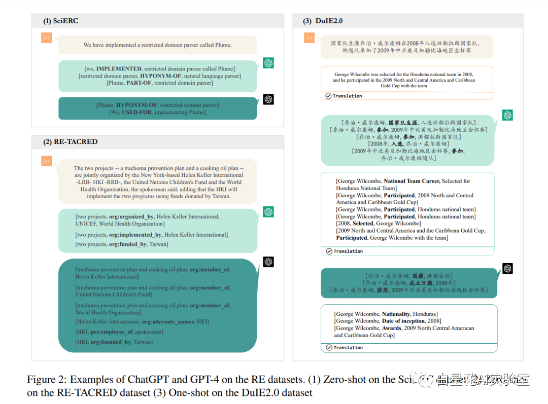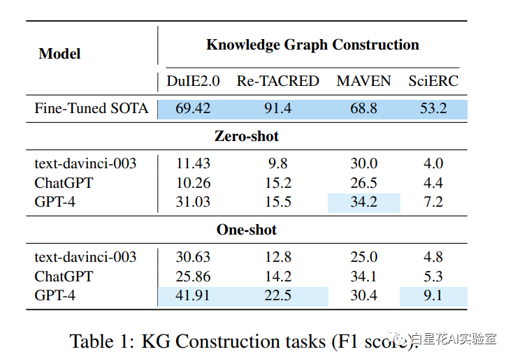 实体和关系提取 我们在SciERC, Re-TACRED, 和DuIE2.0上进行实验,每个实验涉及到测试/验证集的20个样本,并使用标准的micro F1分数进行评估。在此我们分别在每个数据集上使用PaddleNLP LIC2021 IE2,PL-Marker (Ye et al., 2022a)和EXOBRAIN (Park and Kim, 2021)作为基线。如表1所示,GPT-4在这些学术基准提取数据集上无论是zero-shot还是one-shot都取得了相对良好的性能。与ChatGPT相比,它也有所进步,尽管其性能还没有超过完全监督的小模型。