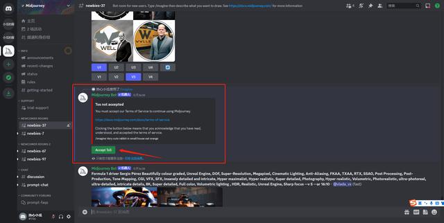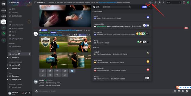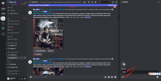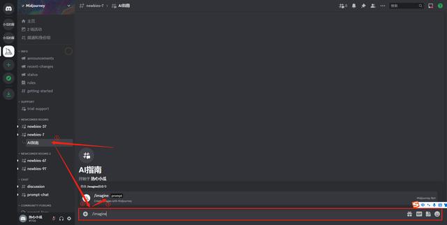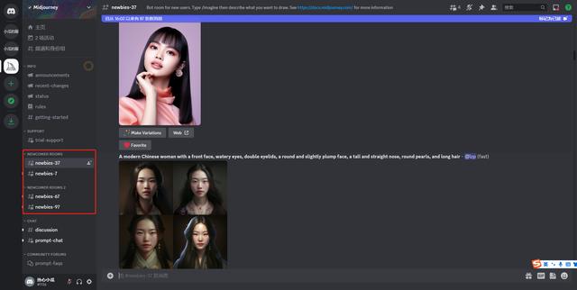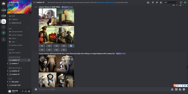 STEP 1:想生成AI图片,随便选择一个左侧的“newbies-xx”的频道(新手区),进入后会看到很多人在这里做的AI图片,我们也可以参考他们输入的“prompt(指令)”有哪些关键词。