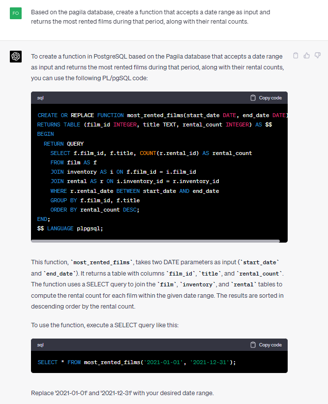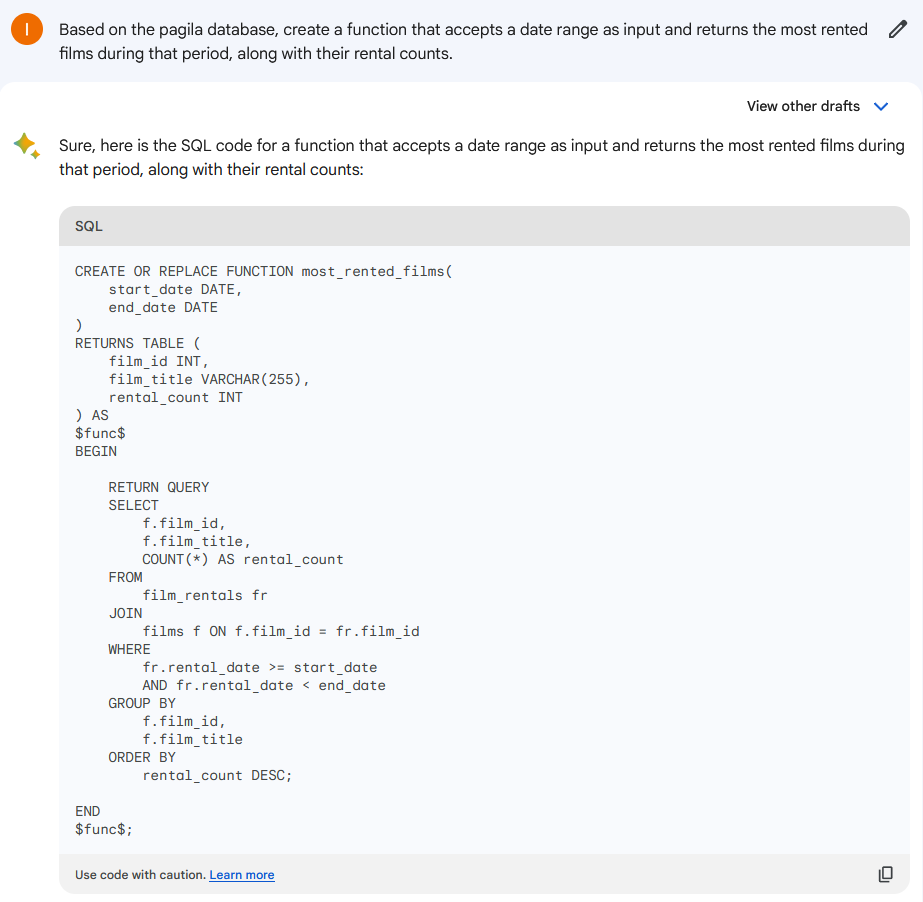 Google Bard 在其脚本中引用了不存在的表;除此之外,rental_count 列的数据类型被错误地指定为 INT。在我们解决了所有这些问题之后,我们终于得到了工作代码。