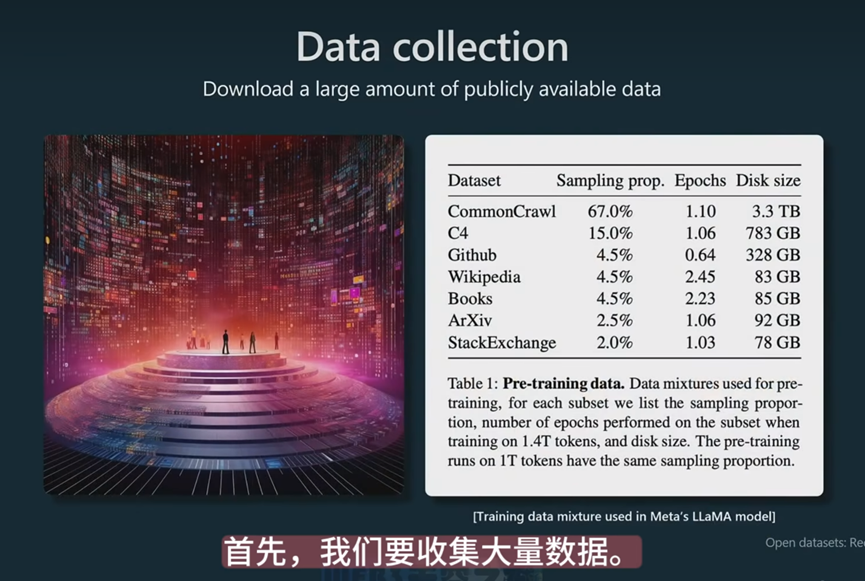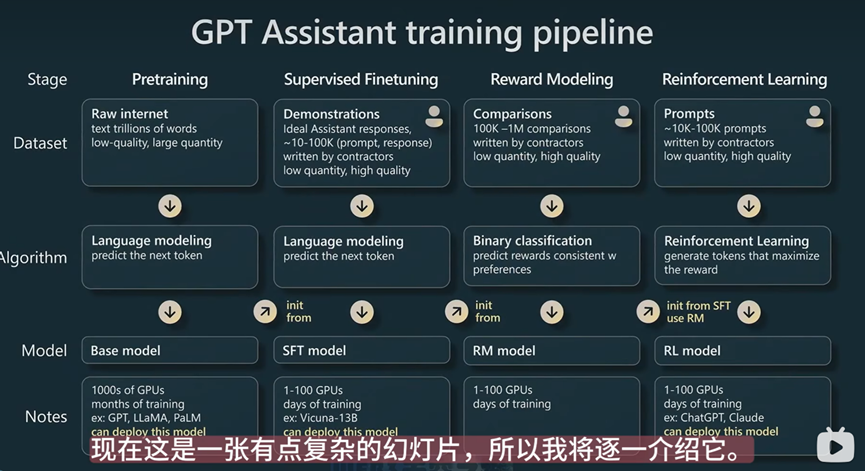这是GPT的训练流程,分为了四个步骤:预训练、有监督的微调、奖励建模、强化学习。花费时间最多和使用GPU数量最多的阶段是预训练,在每一个训练阶段都有相应的数据集去support。