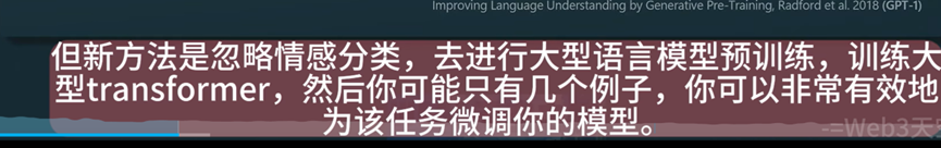 相比于之前要做一个基于文本信息的情感分类算法模型,需要专门进行标注数据,然后进行训练,有了大模型以后,就不需要专门标注数据,只需要对大模型进行预训练和transfomer,然后再通过几个例子进行微调就能获得很好的效果。