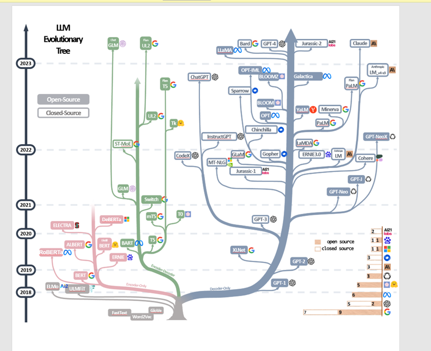 下面是一张很出名的大模型进化路线。谷歌和GPT从2018年开始选择了两条不同的路线,最终证明GPT的路线是正确的。