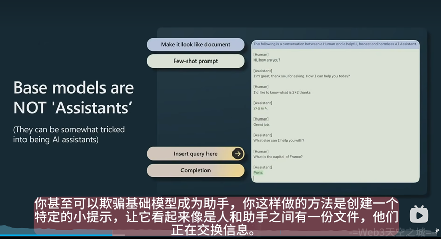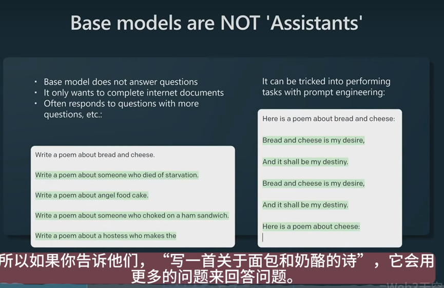 在完成基础模型之后,它还不是一个完整的人工智能助手,基础模型只能不断的根据你提供的句子去进行补全。所以需要提示词工程去让基础模型回答问题。