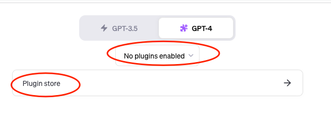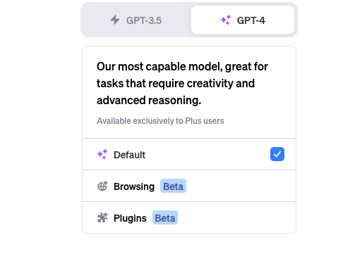 可以看到,GPT-4 对话可以选择默认、Browsing、Plugins 三种模式。