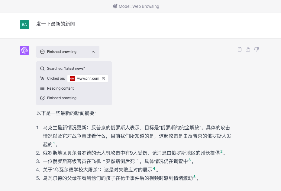 选择 Browsing, 随便让给一下最新的新闻,给出了 5 条新闻。