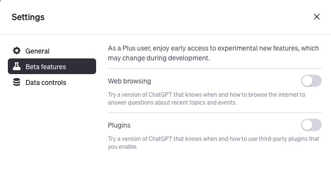 在设置里找到一个 Beta features,可以看到 Web Browsing 和 Plugins 两个选项。