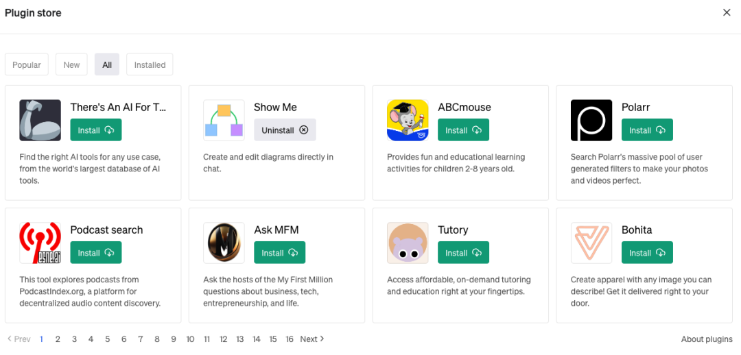 点击 all,则看到 16 页的插件,都不知道用哪个了。