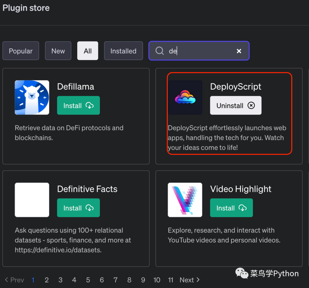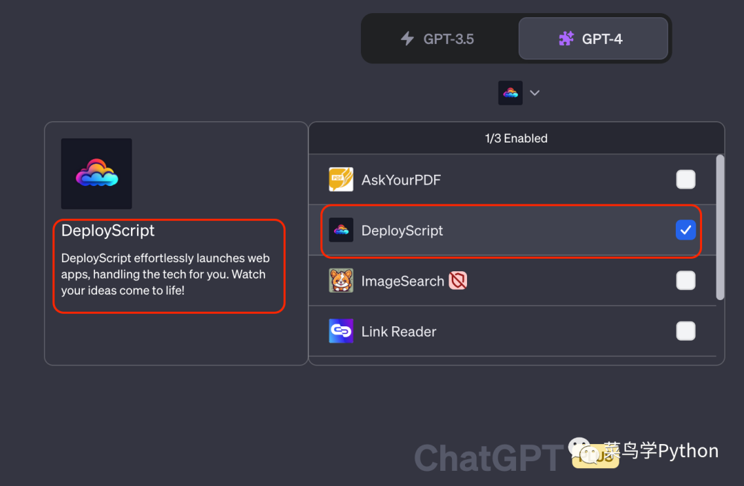 在chatgpt的插件商店里面找到一个叫DeployScript的插件安装即可(我因为已经安装过了,所以显示Uninstall)