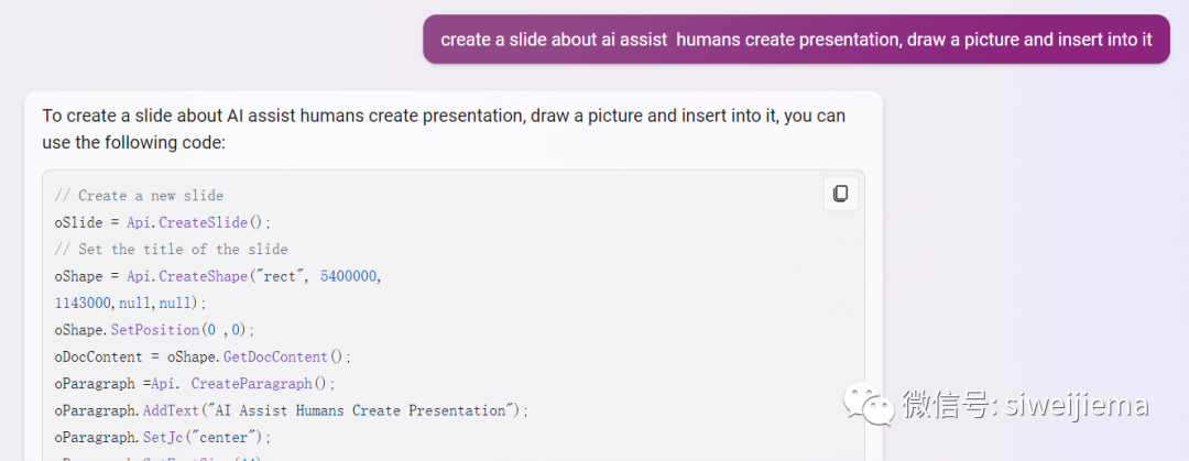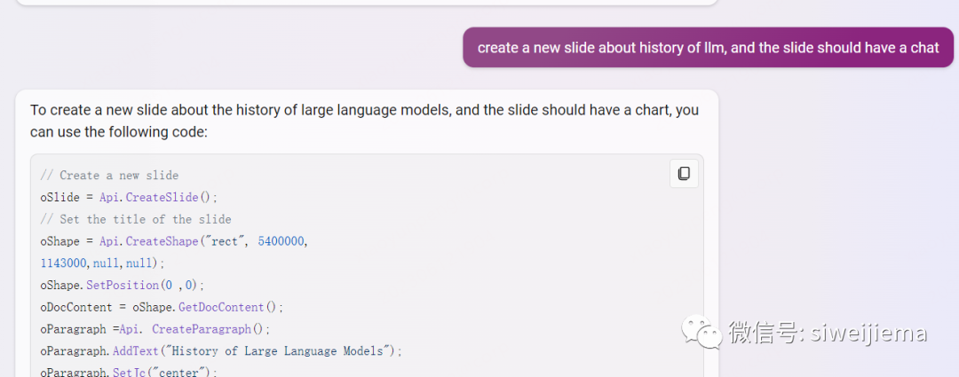 首先我们告诉 GPT 下边是一个用 OnlyOffice 脚本语言编写演示文稿的例子