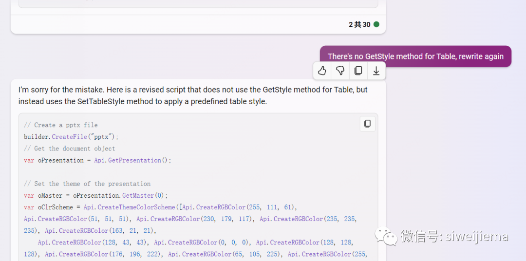 当然,由于它并不知道整个完整的脚本语言,它的语法是有一定错误的,比如它第一次生成的脚本直接运行就会报告“no GetStyle() function”,这时候我们可以直接用语言去告诉 GPT 没有这个函数: