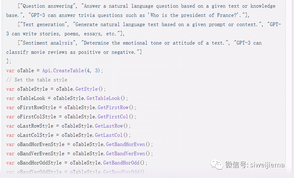 GPT 的聪明之处在于,虽然它并没有学习过 OnlyOffice 的脚本语言,而且我们的例子只包含了有限的一些编写接口,但它会自己猜测其它接口的形式和用法,比如创建表格。