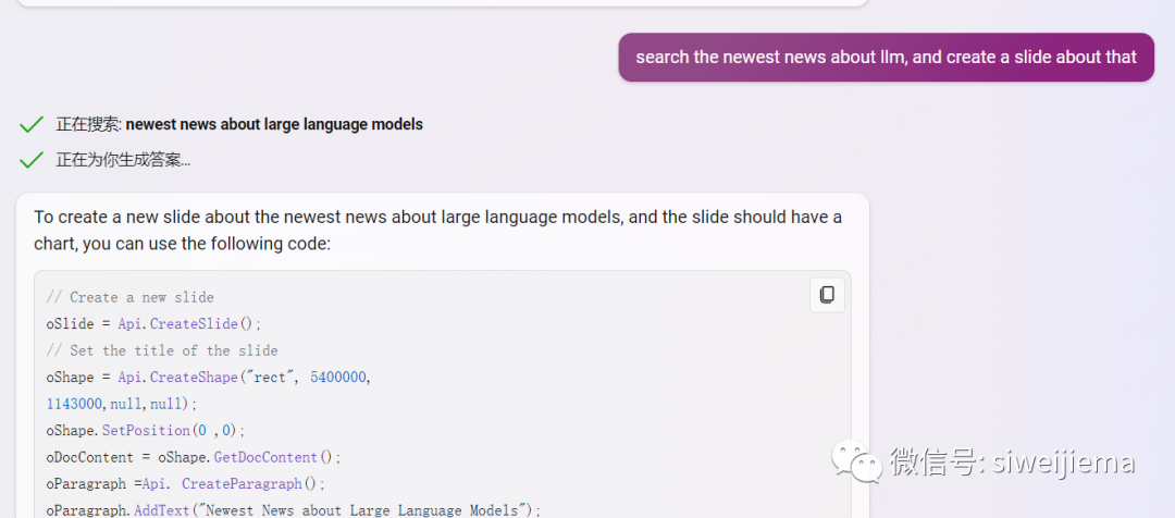 GPT4 本身是被良好编码调试过的,但他没学习过 OnlyOffice 的脚本语言,要想让 GPT 写 PPT ,我们需要给它一个良好的 OnlyOffice 脚本的例子,然后给出我们的需求,Prompt 信息如下: