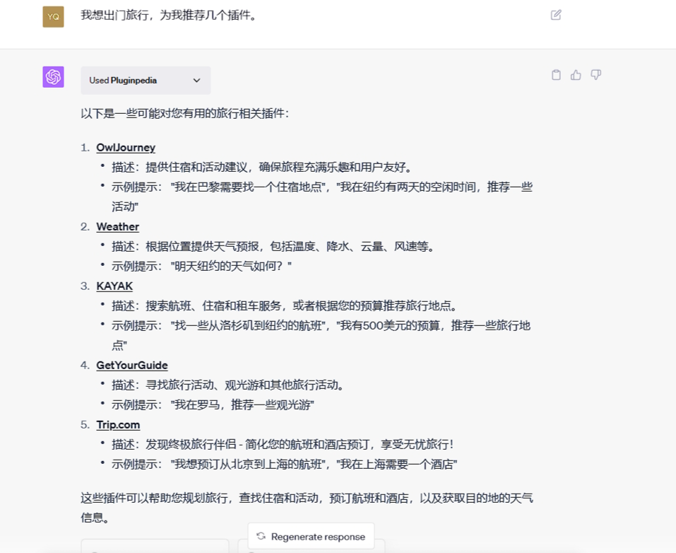 简单举个例子,“我想出门旅行,为我推荐几个插件。”