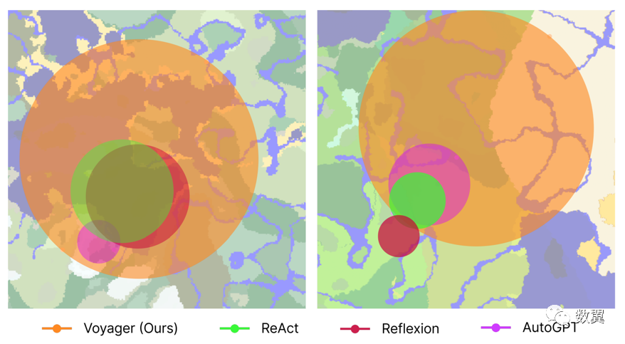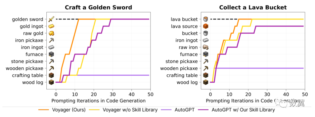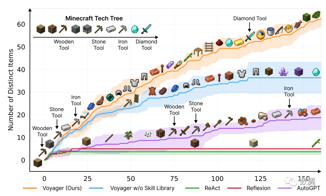 Voyager 在上下文中展示了强大的终身学习能力, 与传统的 SOTA(最先进的)相比,在 Minecraft 中获得的独特物品增加了 3.3 倍, 独特物品增加了 2.3 倍,旅行距离增加了一倍,达到主要科技树里程碑的速度提高了 15.3 倍。研究人员说: