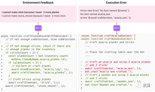图的左侧显示了来自环境的反馈。GPT-4 知道在 Minecraft 中制作一根棍子需要两块木头。右侧显示执行错误。GPT-4 明白 Minecraft 中没有『金合欢锯』,所以必须制作一把『木锯』。