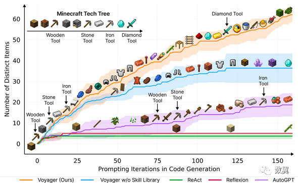 Voyager 通过自我探索不断发现新的 Minecraft 物品和技能,显著优于现有的基于 LLM 的代理。X轴显示提示的迭代次数。