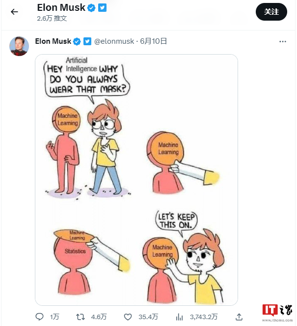 6 月 12 日,埃隆・马斯克近日在其个人推特上发布了一张图片,图片主题意在讽刺 “人工智能”现状,并指出机器学习的本质就是统计。