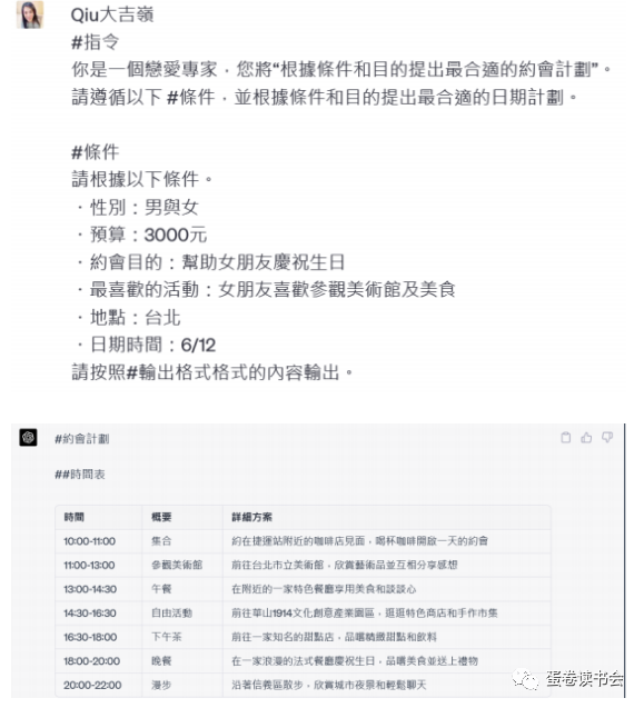 ChatGPT是社交小帮小,你还可以用它帮人做一个约会计划。