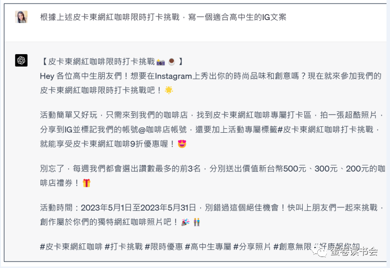 比如,你是一个咖啡营销策划,目标客户是高中生,商品的价格在40到100台币之间。目前,销售的渠道主要是实体店与APP。你想现在要与皮卡东推出款网红咖啡,请ChatGPT提供5个活动的计划。