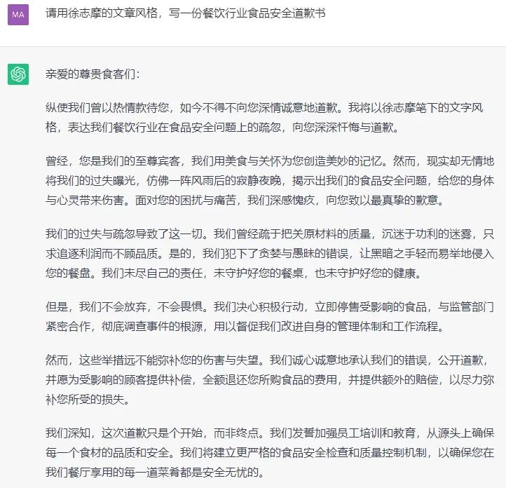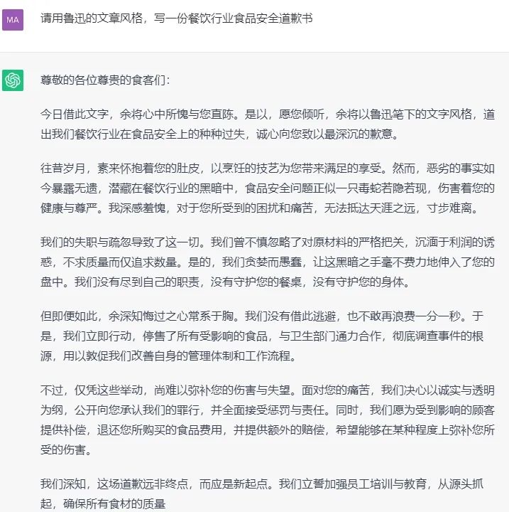 例如:请用鲁迅的文章风格,写一份餐饮行业食品安全道歉书