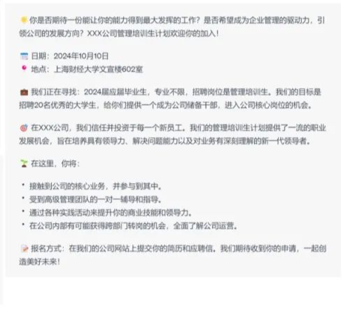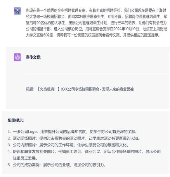 我们可以将这个问题交给ChatGPT。现在我告诉它,我需要在上海财经大学举办一场校园招聘会,招聘对象是2024届的应届毕业生,专业不限。