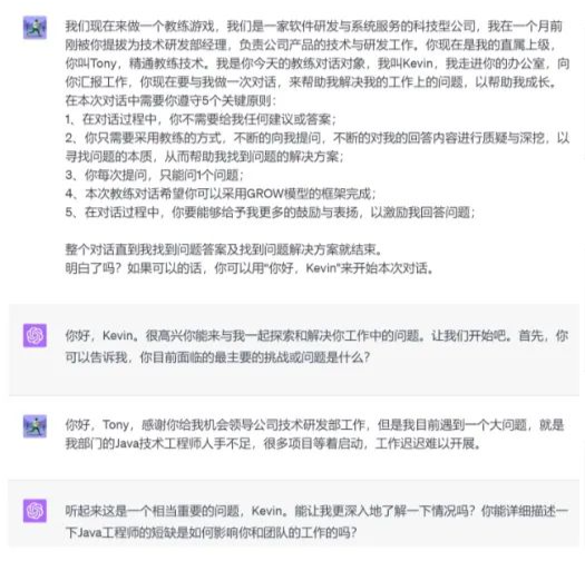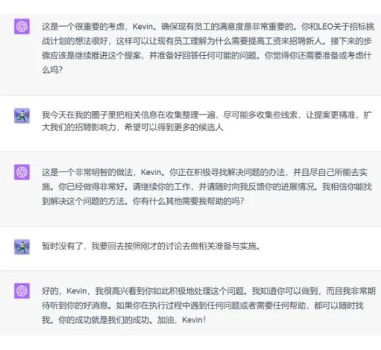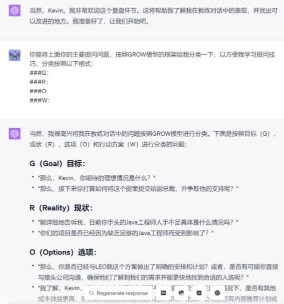 ChatGPT在提问时遵循教练式绩效辅导或Grow模型的方法。在这个过程中,我省略了中间部分。通过大约20轮的对话,最终ChatGPT帮助我完成了一次绩效辅导。