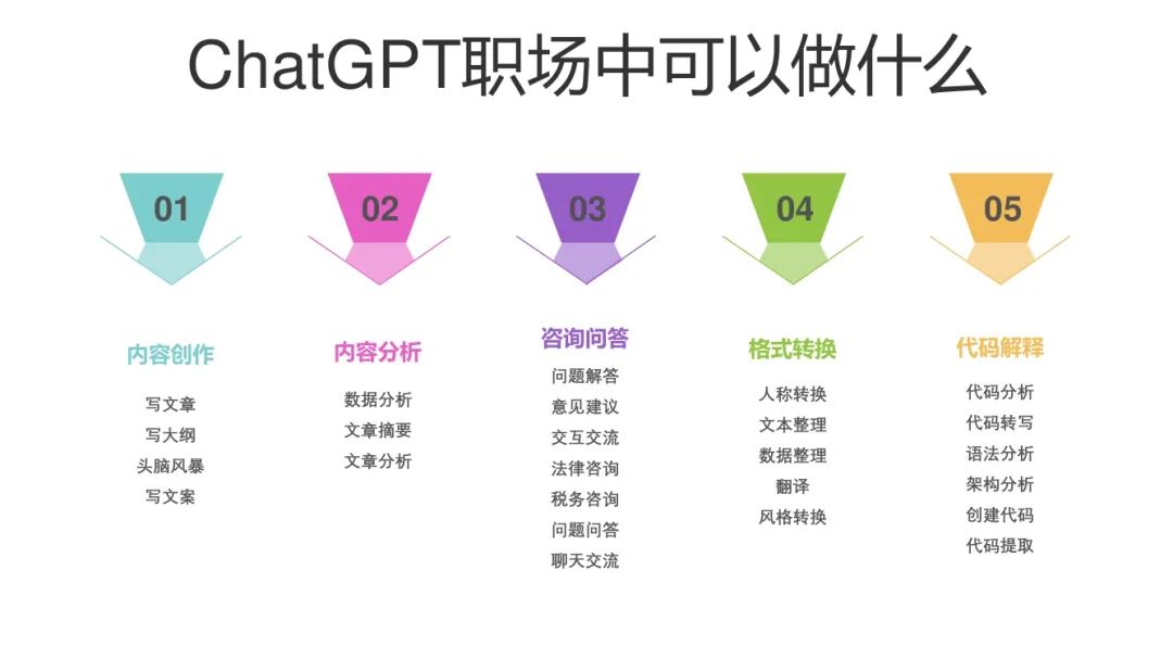 ChatGPT在职场中具有多种功能,我将其大致分为五大类。