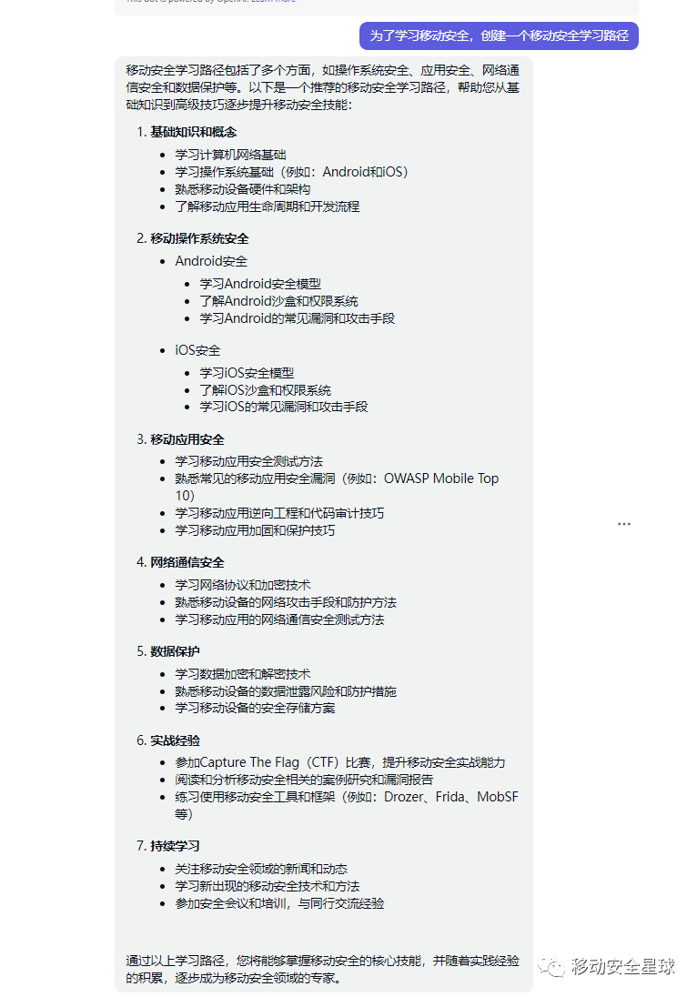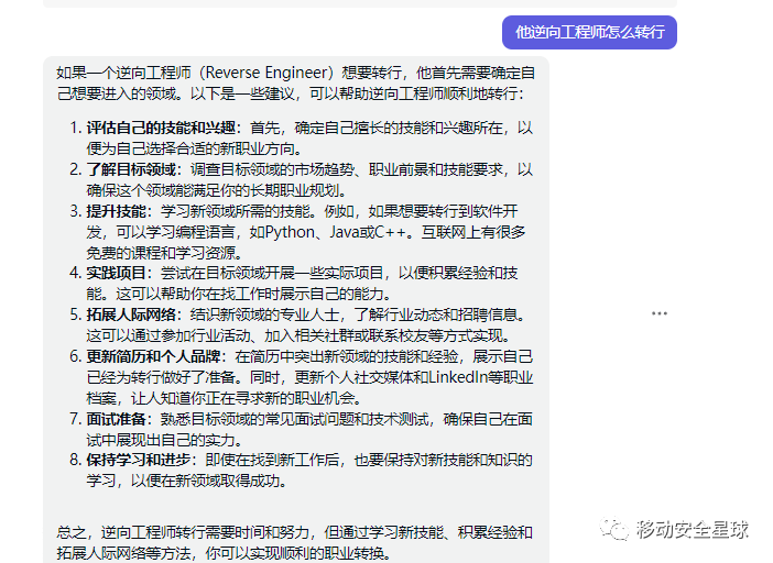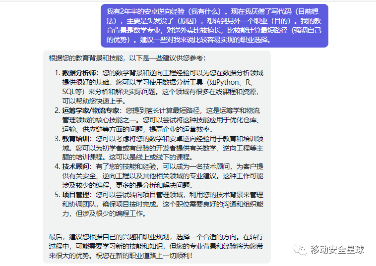 例如你可以对它说:我有2年半的安卓逆向经验(我有什么)。现在我厌倦了写代码(目前想法),主要是头发没了(原因),想转到另外一个职业(目的)。我的教育背景是数学专业,对送外卖比较擅长,比较能计算最短路径(强调自己的优势)。建议一些对我来说比较容易实现的职业选择。而不是直接问他逆向工程师怎么转行。
