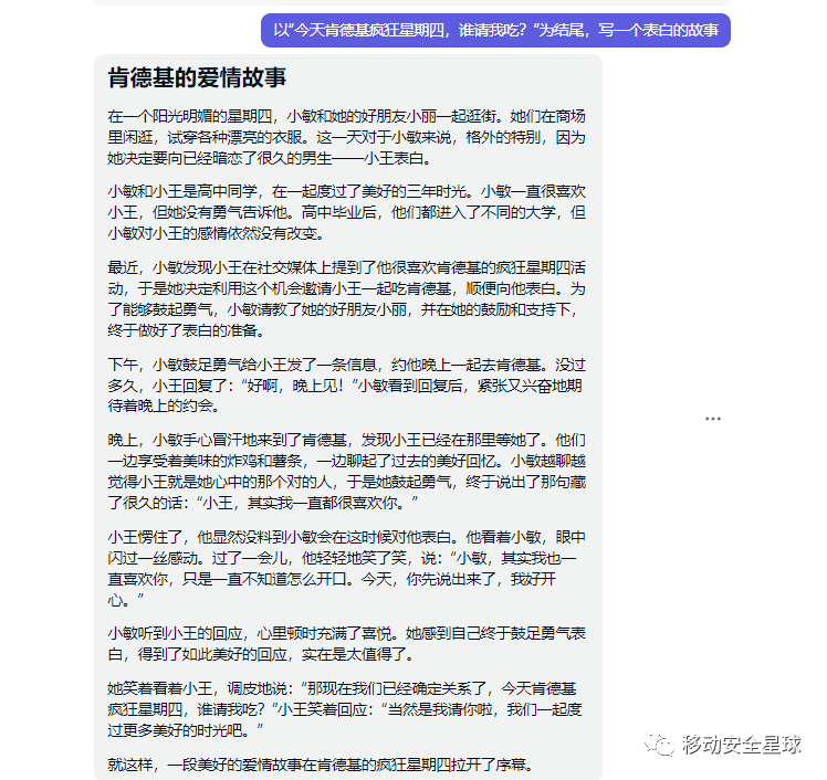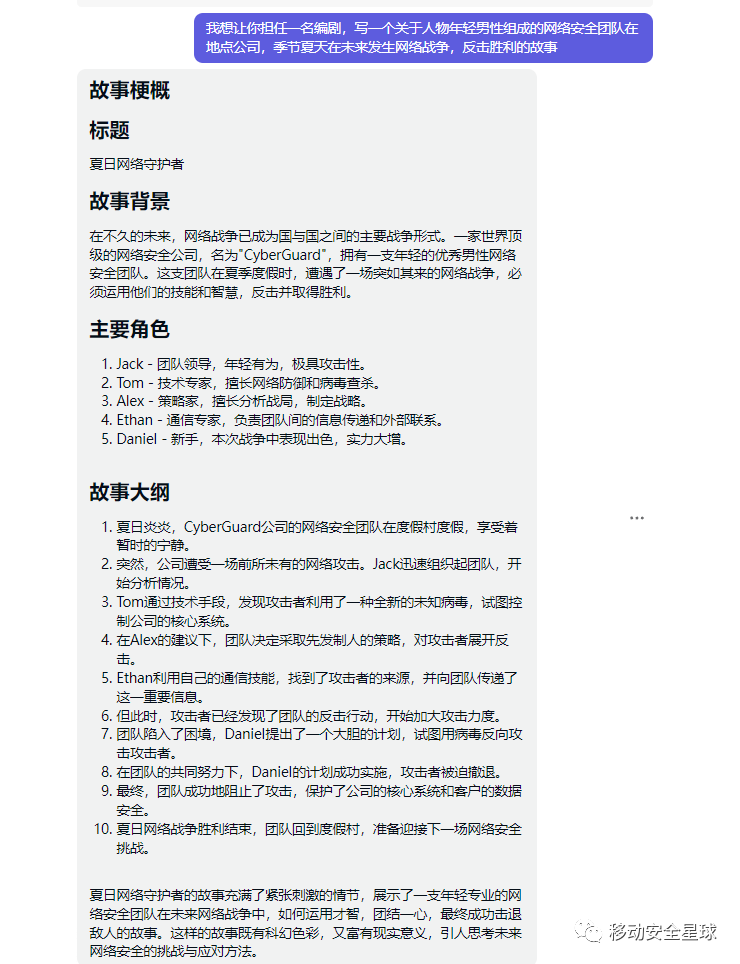 例如你可以告诉ChatGPT:我想让你担任一名编剧,写一个关于人物(例如:年轻男性,安全团队)在环境(地点-公司,季节-夏天,年代-未来)情节(网络战争,第四次世界大战,反击胜利)的故事