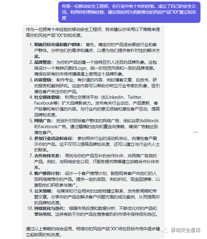 你可以告诉ChatGPT:你是一位移动安全工程师,在行业中有十年的经验。成立了自己的安全公司。利用你的营销经验,建议我如何为我新推出的风控产品“XX”建立知名度