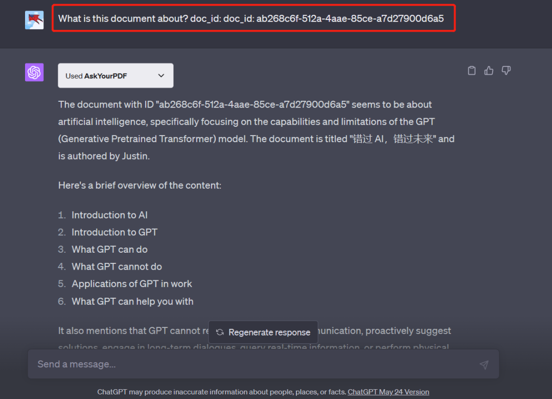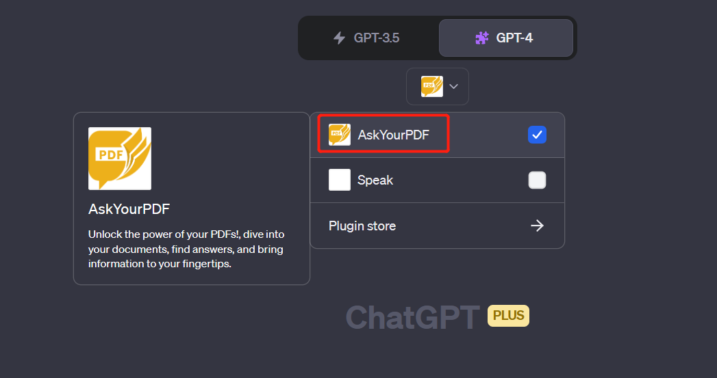 关于插件。有趣的是可以同时使用多个插件。下面看一个测评场景,使用一个AskYourPDF插件。该插件使用户能够上传PDF文档,从中提取信息,并根据文档内容提出问题。按照所述步骤,用户可以利用这一功能,获得与上传的PDF文件相关的摘要和答案。