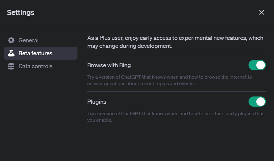 Step 3 – 点击 ‘Beta Features’。打开 ‘Web browsing’ 和 ‘Plugin’。