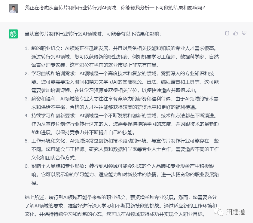5、我正在考虑从宣传片制作行业转行到AI领域,你能帮我分析一下可能的结果和影响吗?