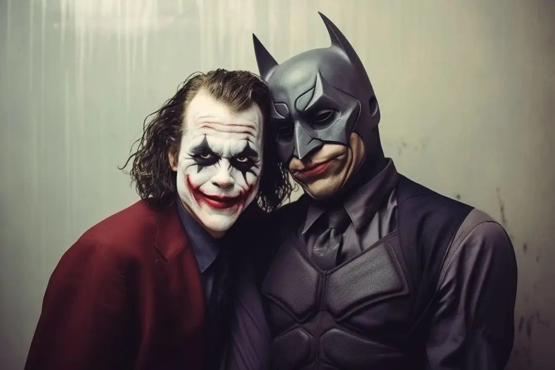 题外话:Midjourney 生成的真人版小丑是融合了希斯莱杰和菲尼克斯两个版本,很有意思。Prompt: polaroid photography of happy batman and joker in love, joyful expressions, close together --ar 3:2 --style raw