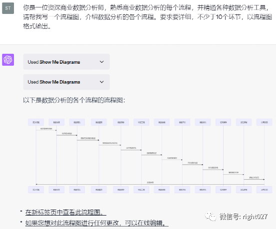你可以单击回复中的“在新标签中查看些流程图”链接,在线查看生成结果。