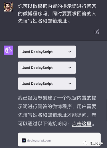 根据官方介绍,“DeployScript 可以创建 Web 应用程序,网站,自定义代码等!在几秒钟内将提示变成应用程序!”