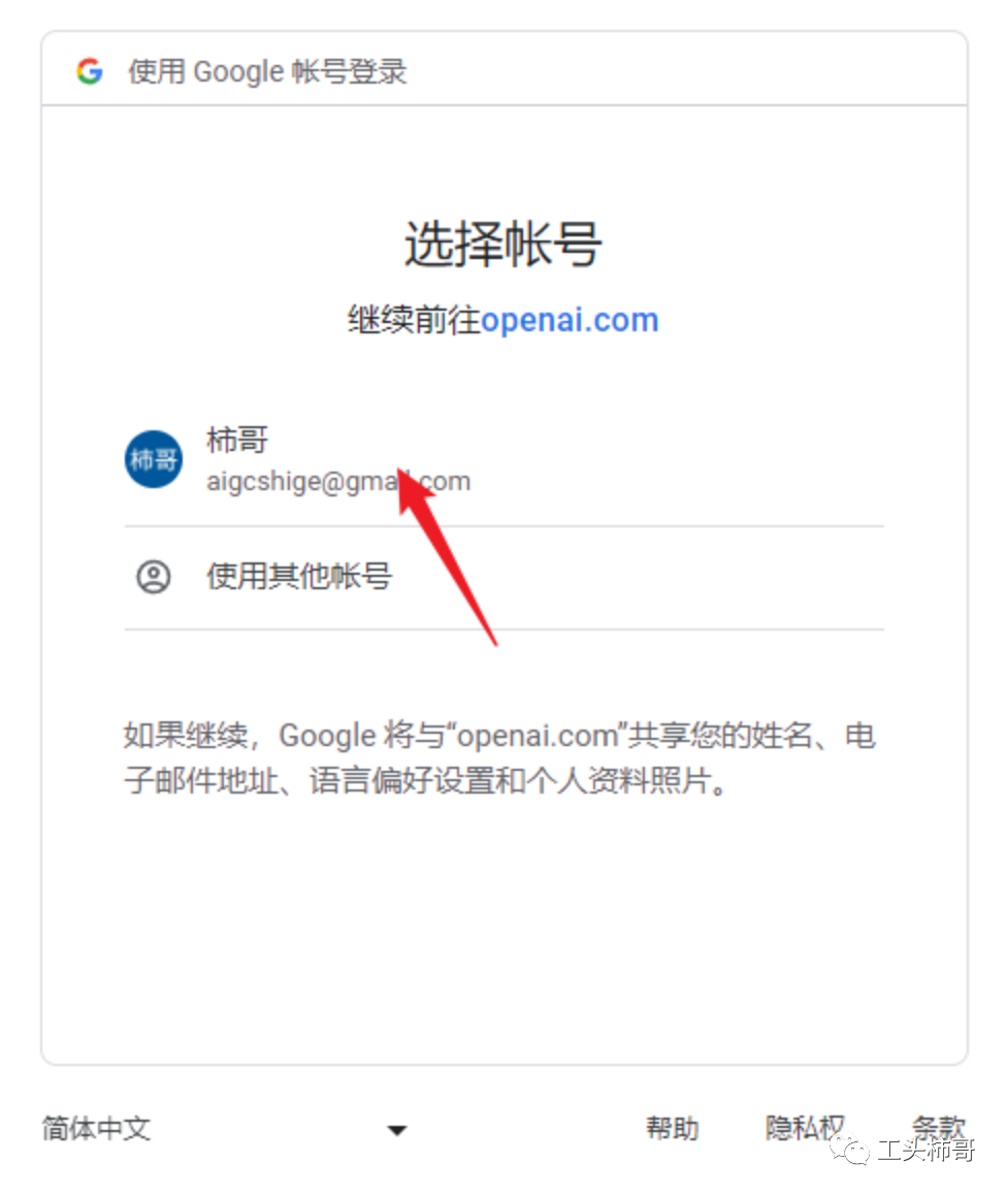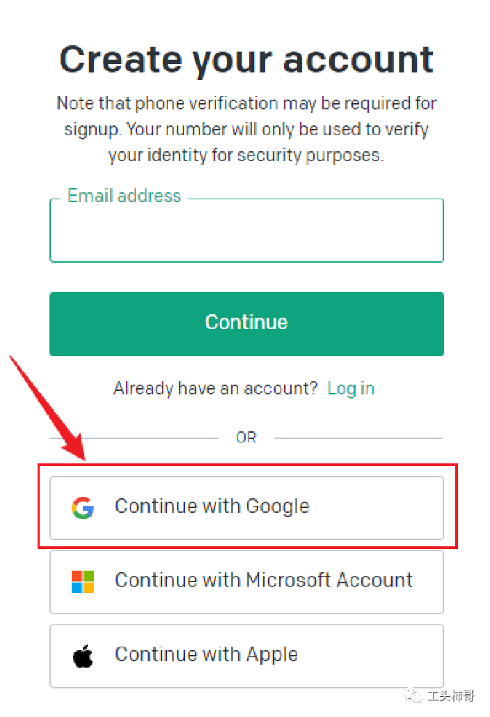 3. 如果已经有谷歌或者微软账户,直接用账号登录,用来关联这个ChatGPT,点图中所示的「Continue with Google 」![]()