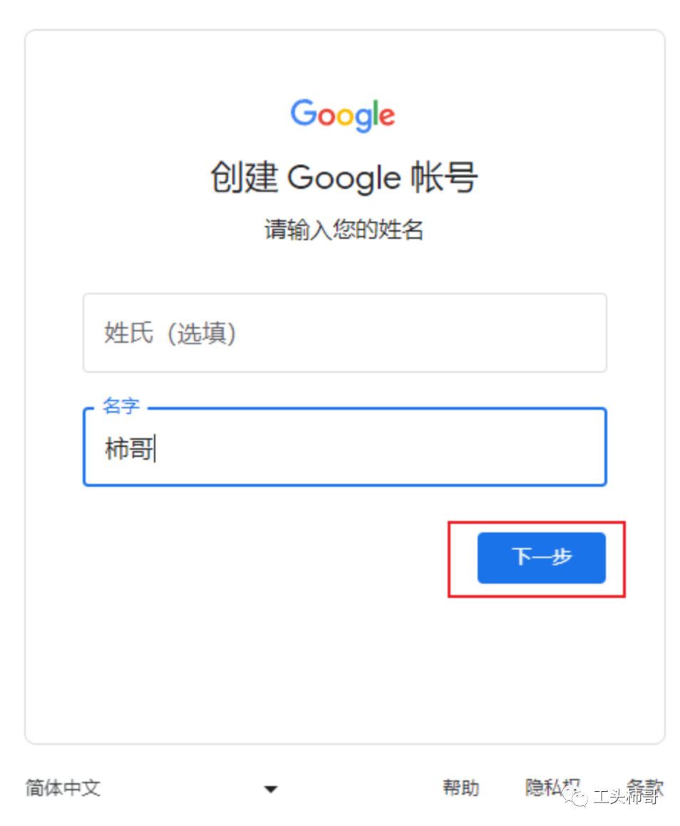 5. 填写创建谷歌账号的信息,姓可以不填,填好名字及后面的信息,点击「下一步」,给谷歌账号,也就是gmail的谷歌邮箱起一个用户名,然后设置好密码![]()