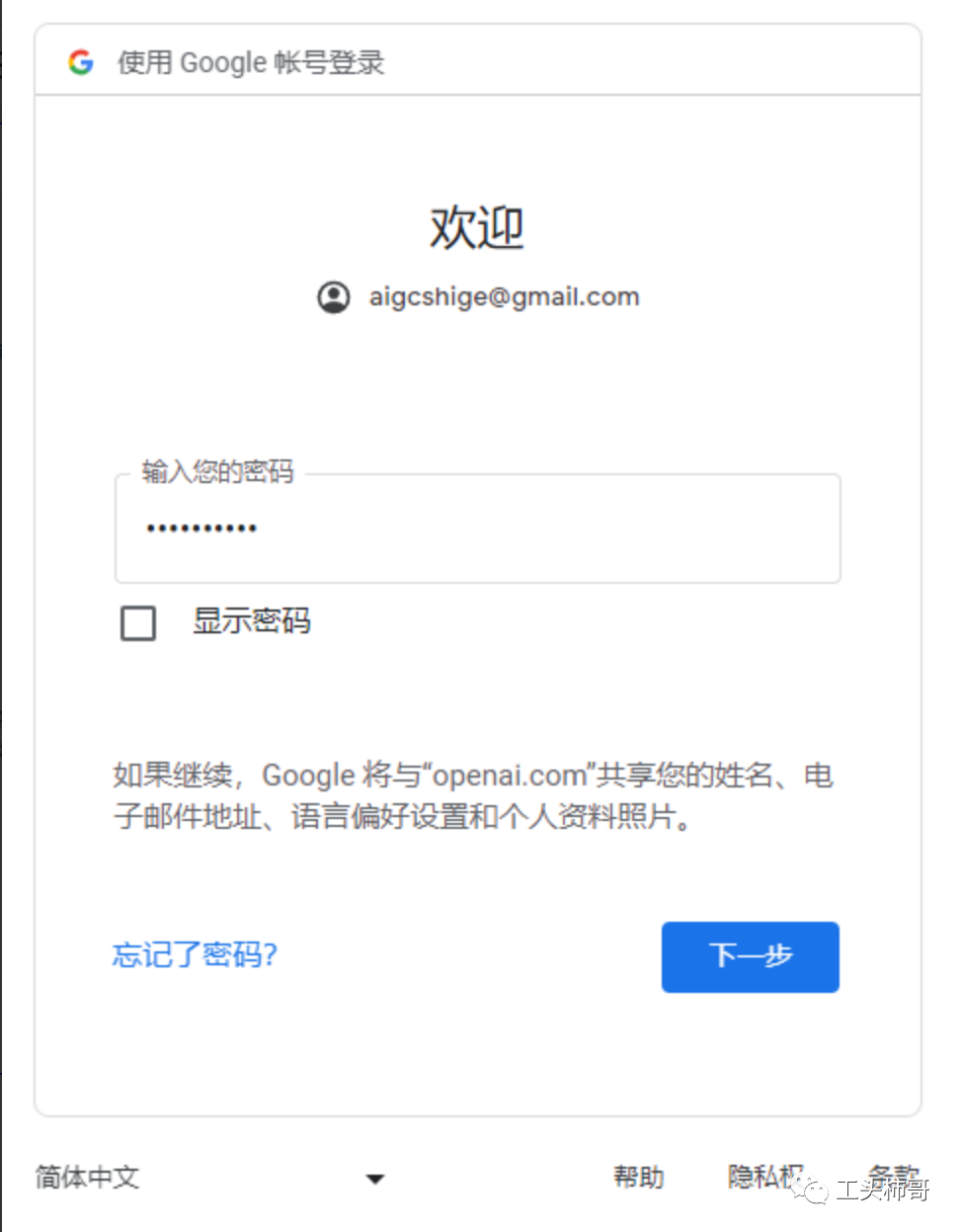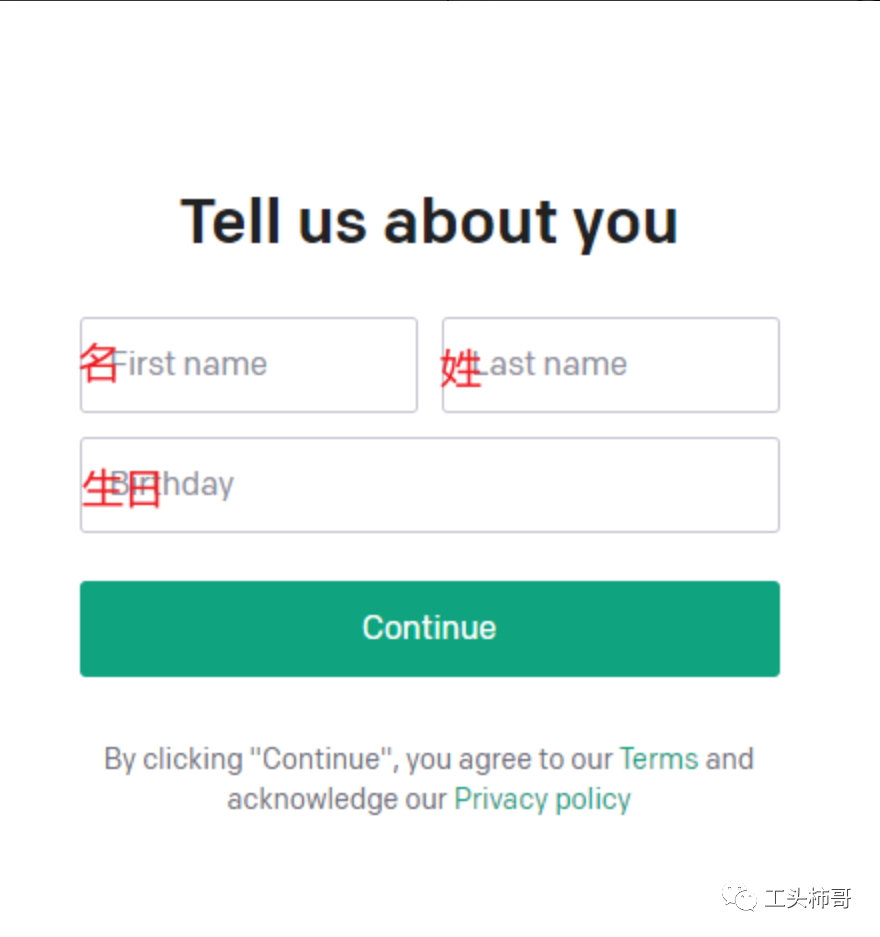 7. 用刚刚创建的谷歌账户登录关联ChatGPT账户,然后填入ChatGPT的基本注册信息,点「Continue」![]()