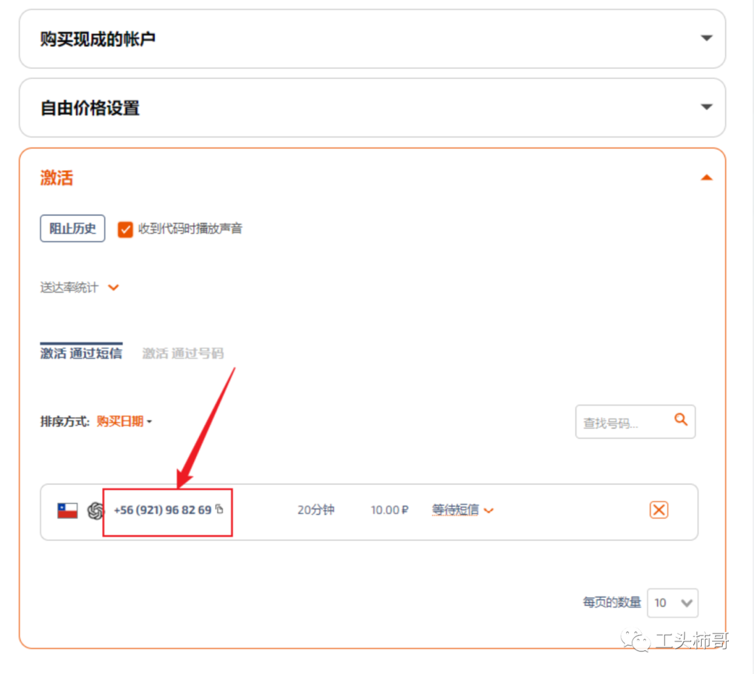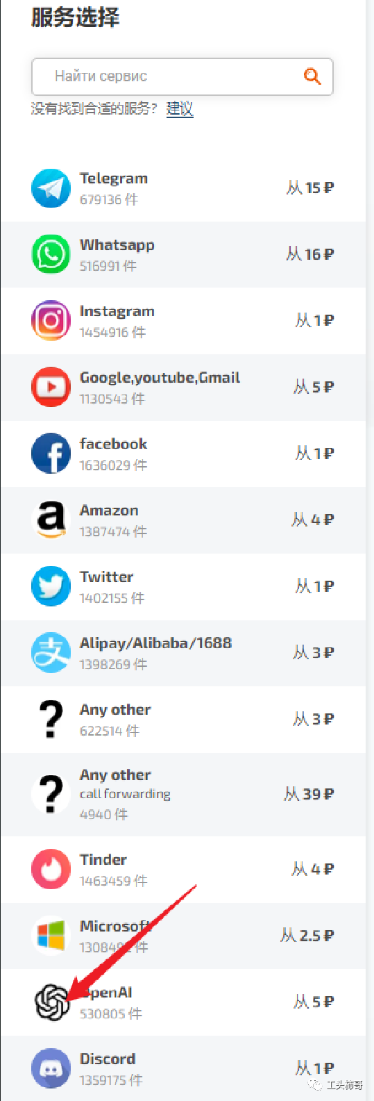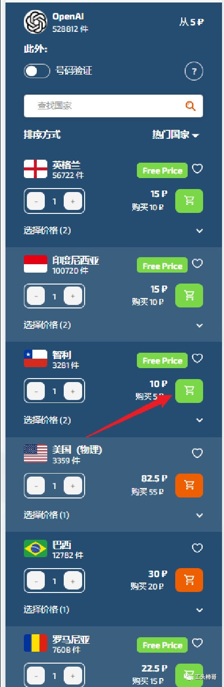 d. 在页面左侧的服务列表中找到「OpenAI」,因为我们要使用ChatGPT实际注册的是OpenAI账户,之后我们选个便宜的买就好了,这次柿哥选智利。(这里要注意,点击绿色购物车即完成扣款,同时页面会刷新显示你可以用的手机号,这个过程中可能比较慢,不要重复点击,稍微等一下)![]()