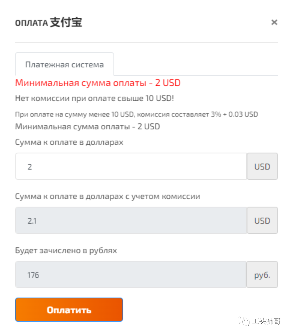 c. 之后先点击页面右上角充值,在页面下划找到支付宝,点击后在弹窗中输入要充值的金额,现在的要求是最低充$2,那就填2,点击下方的「支付」按钮后便会跳出二维码,支付宝扫码即可![]()