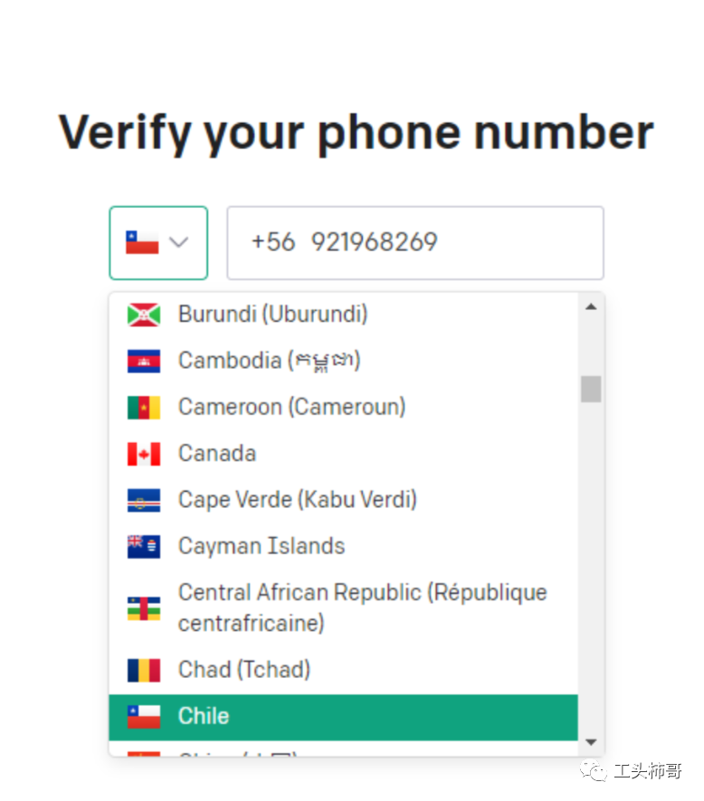 9. 回到ChatGPT的注册页面,选择刚刚手机号对应的地区,找不到就百度一下你购买的手机号所属国家的英文写法,然后填写刚刚的手机号(如果是粘贴的,注意把区号去掉,如果是自己填的,不要把括号写进去)![]()