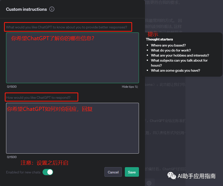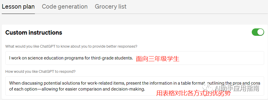 ChatGPT定制指定(Customer Instructions)本质上是让AI更懂你、培养默契,从而帮我们和AI更好地磨合,提高生产力。