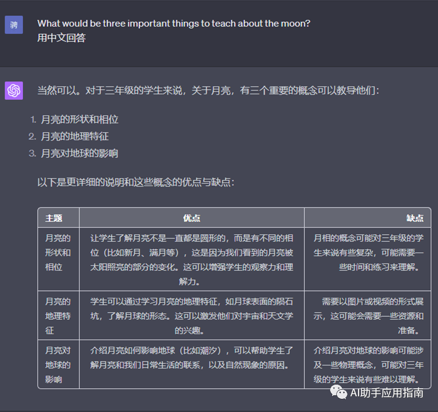 在这种情况下,ChatGPT理解到我们的受众是三年级学生,会列出三个教学主题,并以表格形式列出每个主题的优缺点。例如,对于"月亮的形状"这个主题,优点是可以增强学生的观察力和理解力,缺点是这个概念有些复杂。